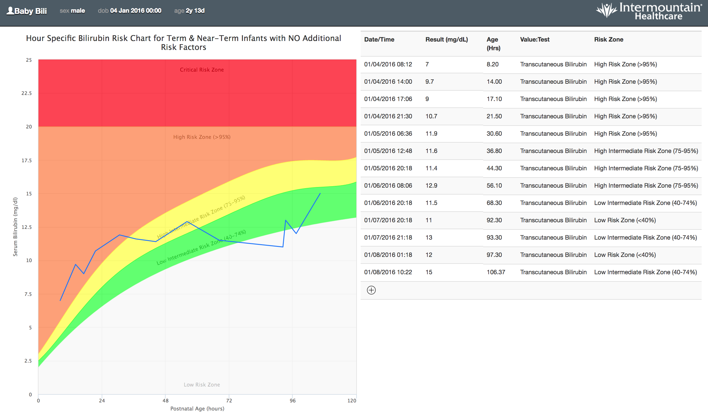 The Intermountain Healthcare Bilirubin Risk Chart App is based on Intermountain’s HELP2 application of the same name. This app is for demonstration purposes only and is not approved for clinical use. It was created to highlight the concept of the HSPC model, which creates a method of sharing clinical applications currently locked up in a single organization or EHR vendor and make it available to all healthcare providers.